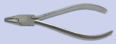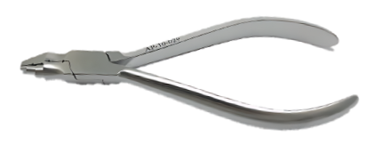 Pinza para colocación de arcos. Posee una punta versátil y estriada para un buen agarre, su forma angulada facilita el trabajo permitiendo un mejor acceso.